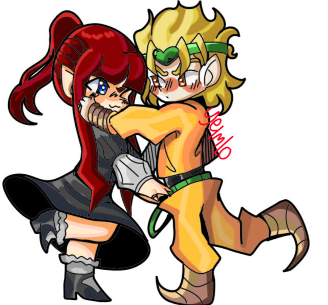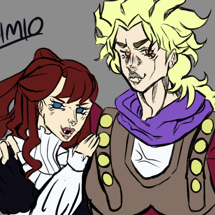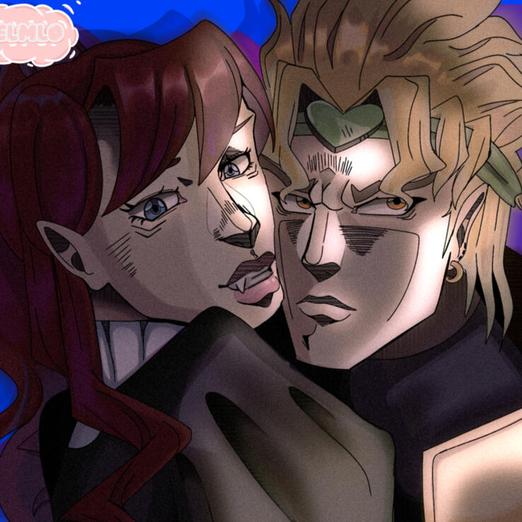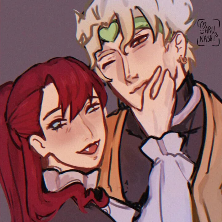 Aurora fell for Dio first, Dio fell for her harder. Dio tries to hide his love for Aurora, but not being good at it. They met at a library, and connected over their knowledge of the Stone Mask.