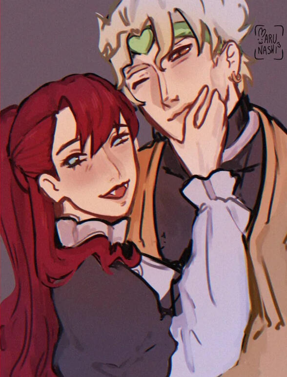 Aurora fell for Dio first, Dio fell for her harder. Dio tries to hide his love for Aurora, but not being good at it. They met at a library, and connected over their knowledge of the Stone Mask.